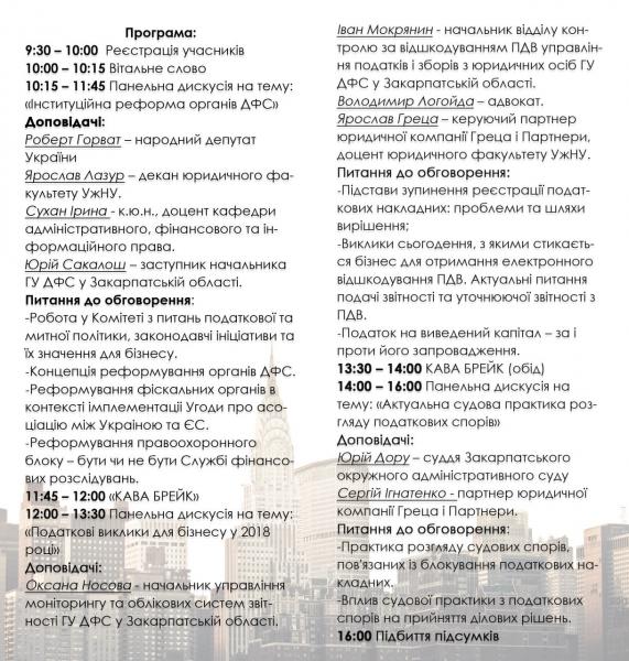 Фахівці Головного управління ДФС у Закарпатській області, юридичного факультету УжНУ, юридичної компанії «Греца & партнери», Закарпатського осередку АПУ Ліга студентів візьмуть участь в заході, обговорять нововведення у податковому законодавстві та виклики для бізнесу у наступному році.