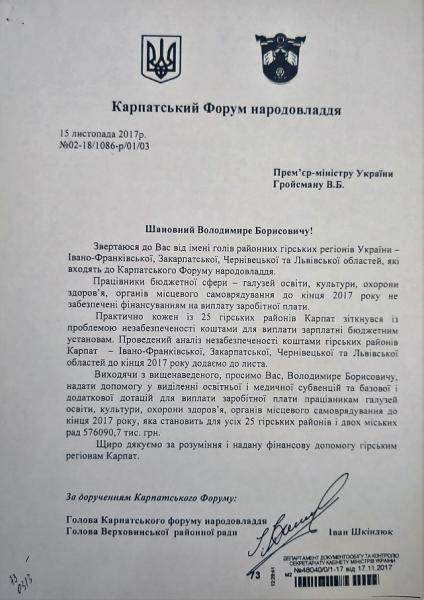 Карпатський форум народовладдя, який об’єднує гірські райони Закарпатської, Івано-Франківської, Чернівецької та Львівської областей, звернувся до прем’єр-міністра України Володимира Гройсмана з проханням виділити освітню й медичну субвенцію, а також базову та додаткову дотацію для виплати зарплати працівникам бюджетної сфери.