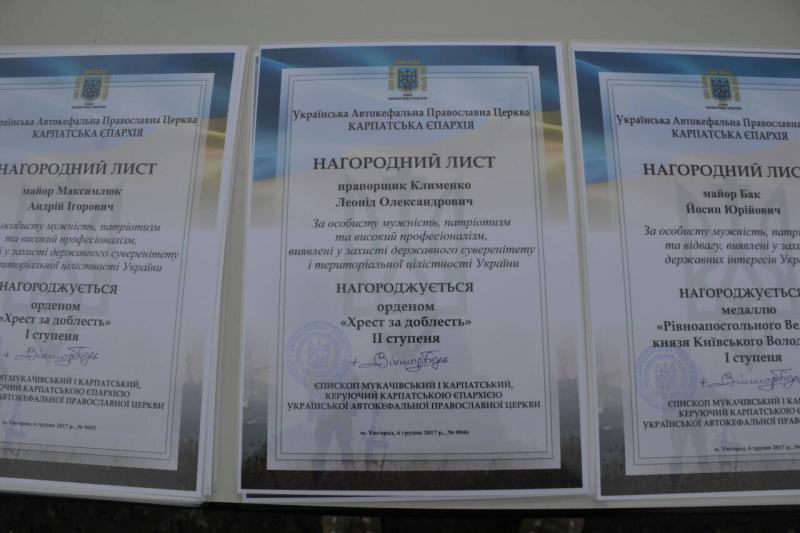 Ордени Хрест «За доблесть» IтаIIступеня, медалі «Рівноапостольного Великого князя Київського Володимира» Iта IIступеня, медалі «Святого апостола українського Андрія Первозванного» Iта IIступеня гвардійці отримали з благословення Преосвященного Віктора (Бедь), єпископа Мукачівського та Закарпатського, керуючого Карпатською єпархією Української Автокефальної Православної Церкви з рук канцлера Консисторії Карпатської єпархії УАПЦ протоієрея Сергія Урста та голови єпархіального відділу з духовної опіки в правоохоронних органах, пенітенціарній системі та ЗСУ протоієрея Олександра Смоліна.