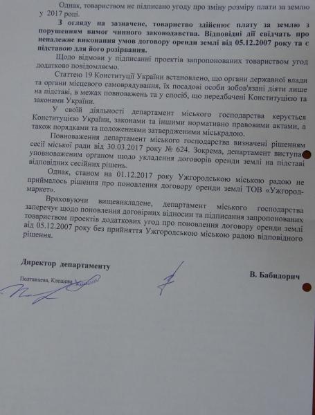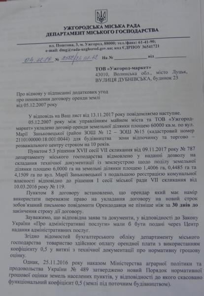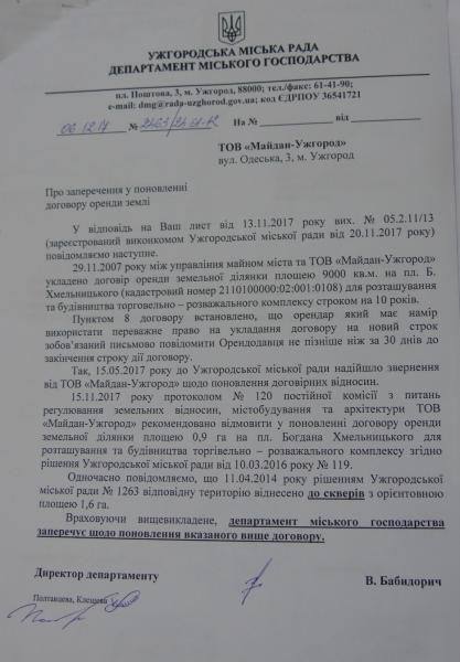 Як повідомив міський голова Богдан Андріїв, про відмову у підписанні додаткових угод та про заперечення проти поновлення договірних відносин департамент міського господарства поінформував орендаря земельної ділянки площею 60000 кв. м по вул.Марії Заньковецької - товариство "Ужгород-Маркет" - листом від 4 грудня 2017 року. Іншим листом, від 6 грудня 2017 року, департамент міського господарства поінформував ТОВ "Майдан-Ужгород" про заперечення щодо поновлення договору оренди земельної ділянки площею 9000 кв. м на площі Богдана Хмельницького. "Ми підтвердили свою принципову та послідовну позицію, що ці території в Ужгороді повинні залишатися зеленими зонами", - наголосив Богдан Євстафійович.