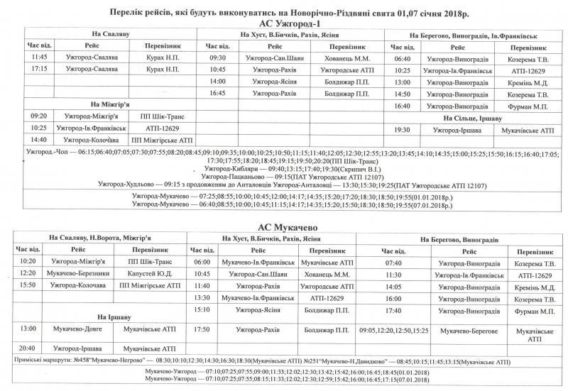 Закарпатські перевізники спільно з автостанціями розробили та узгодили графіки руху автобусів на приміських та міжміських маршрутах області на свята – 1-го та 7-го січня.