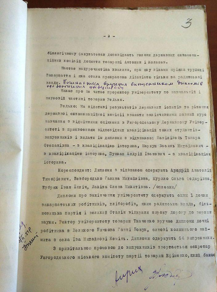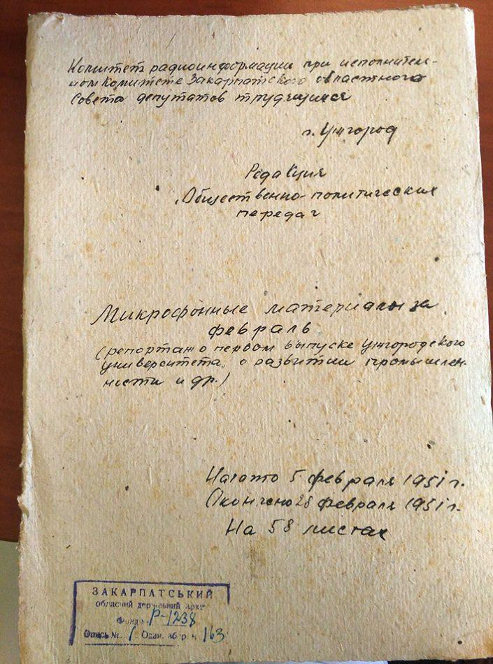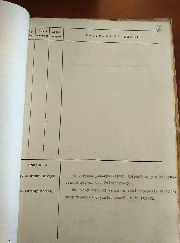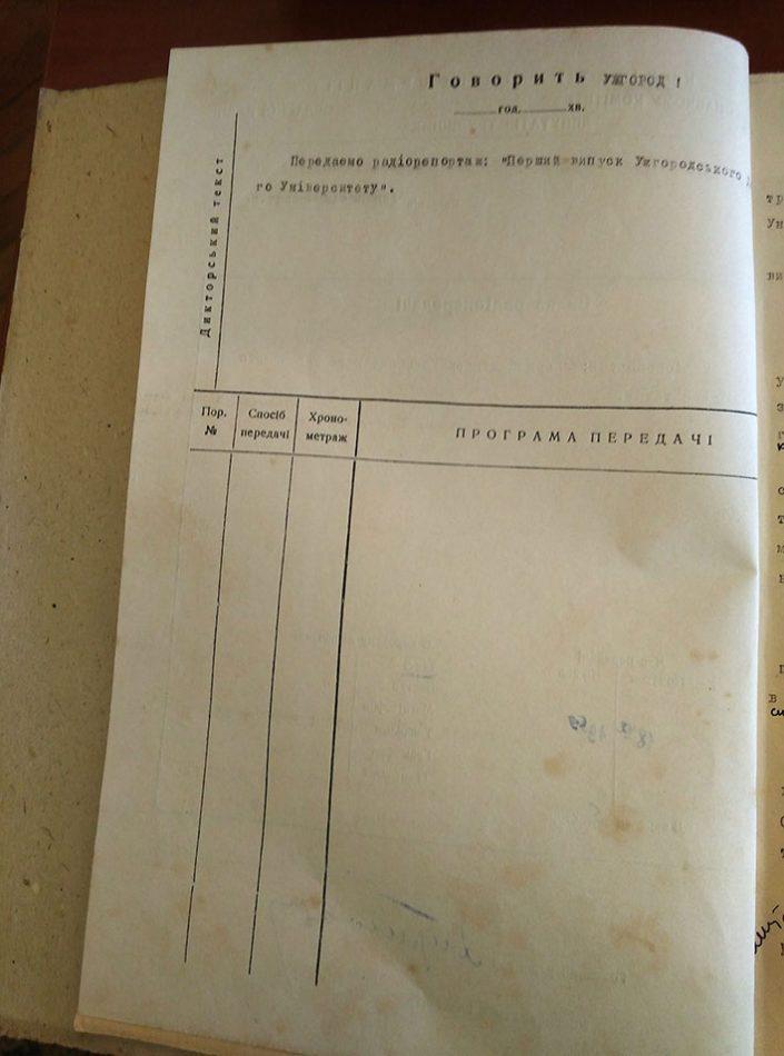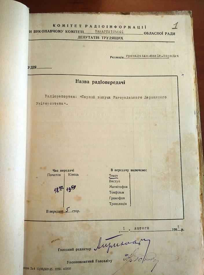 Варто зауважити, що у 1945 році УжДУ відкрили з чотирма факультетами: історичним, філологічним, біологічним і медичним. Однак у 1951 році, як зазначено у радіорепортажі, виш закінчили історики, біологи і філологи. Припускаємо, що в медиків навчання тривало довше, ніж 5 років, тому їх не згадують у програмі. Для радіослухачів 1951 року ця радіопередача була справжньою подією. А для сучасників вона цінна тим, що тодішній кореспондент обласного радіо зафіксував для нас перший випускний перших студентів – безпосередніх учасників розвитку вищої освіти на Закарпатті.