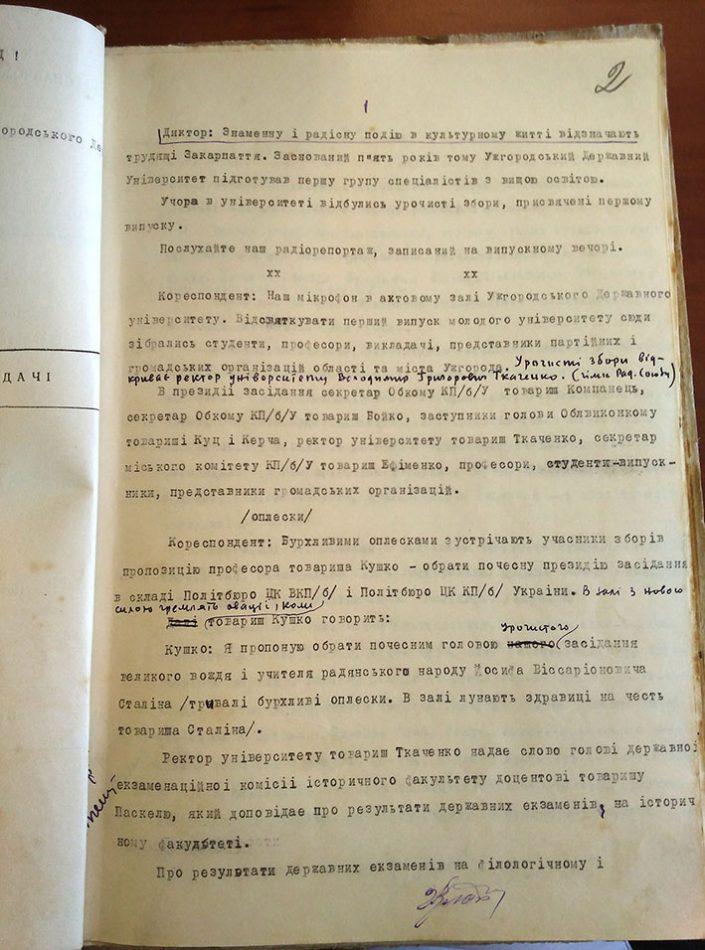 Радіорепортаж з першого випускного в УжДУ кореспондент завершував в дусі тодішньої ідеології: «З величезним піднесенням прийняли текст привітального листа великому вождеві і учителеві радянського народу товаришеві Сталіну».