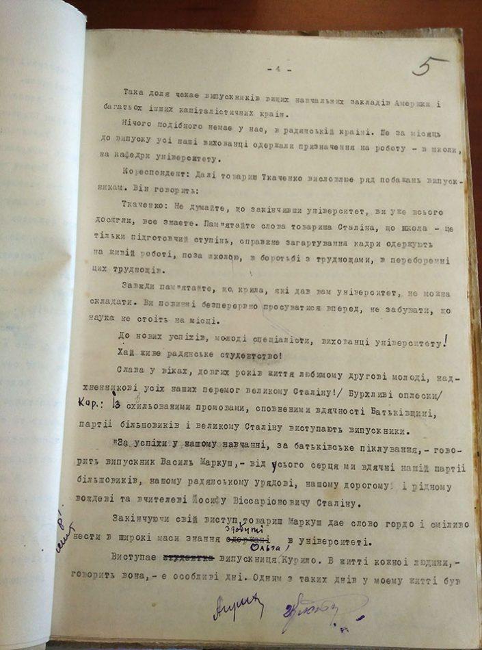 Після цього виступали випускники. Товариш Маркуш у своїй промові теж дякував передусім партії, радянському народу, «дорогому і рідному вчителю Йосифу Віссаріоновичу Сталіну», а також обіцяв нести в широкі маси знання, здобуті у виші. Ольга Курило пригадала щемливу мить вступу до університету і ділилася хвилюваннями від випуску, а Іван Бубряк логічно повторив слова попередника, прославляючи партію, й закликав випускників віддавати всі свої сили і знання на служіння радянській Вітчизні, народові.