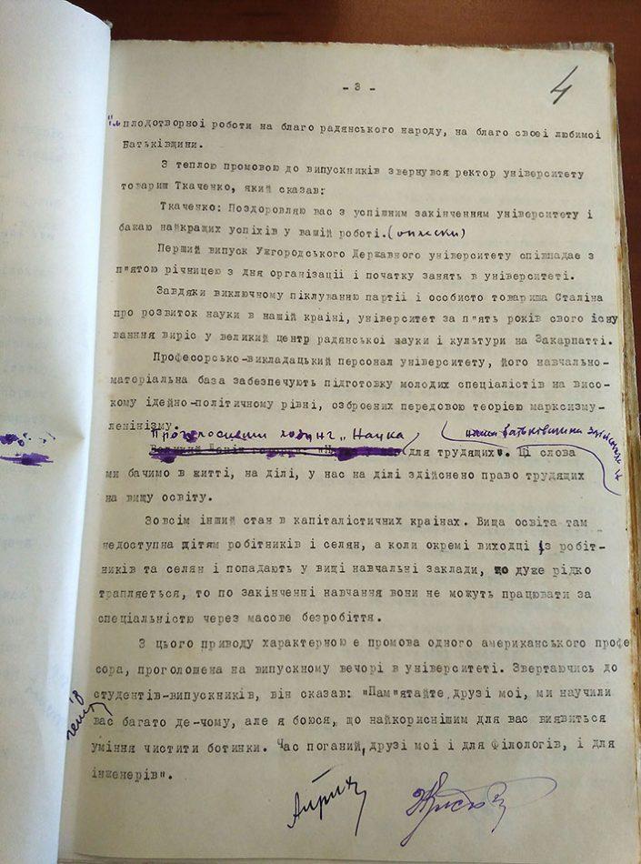 «Завдяки виключному піклуванню партії і особисто товариша Сталіна про розвиток науки в нашій країні, університет за п’ять років свого існування виріс у великий центр радянської науки і культури на Закарпатті», – додав Володимир Ткаченко.