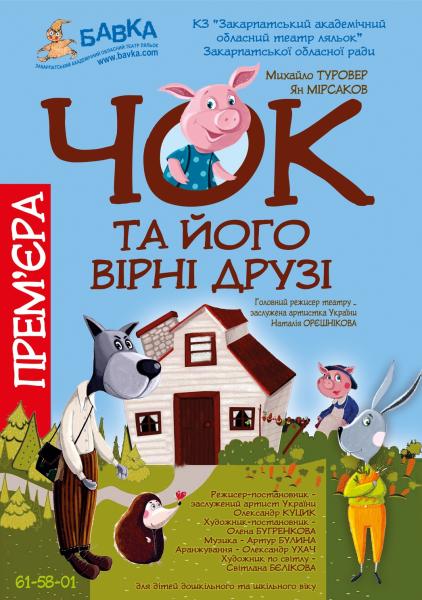 “Чок та його вірні друзі” – весела й повчальна вистава про дружбу, винахідливість і взаємодопомогу. Життєрадісне та кмітливе поросятко Чок перемагає голодного і хитрого Вовка. Допомагають йому вірні друзі – старий Їжачок, хоробрий Зайчик, а також любляча Мама поросятка. Разом їм вдається провчити злого нападника.