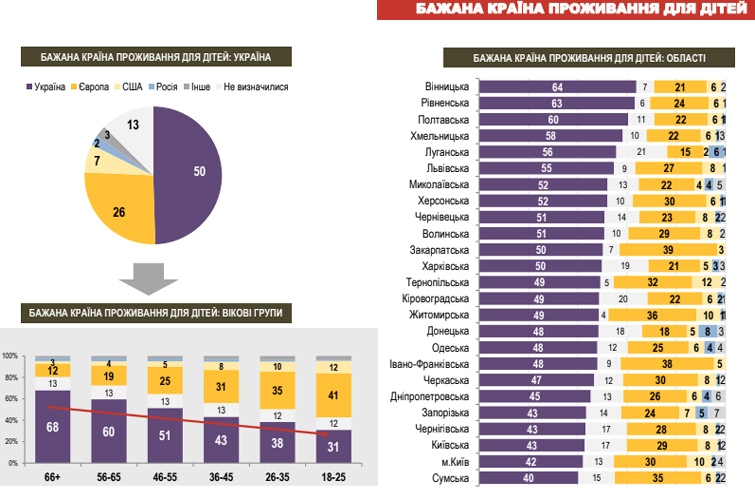 Для проживання своїх дітей 50% опитаних кращою країною обрали Україну. У той же час чверть учасників дослідження хотіли б, щоб їх діти жили у країнах Європи. Ще 7% – у США, 3% – у інших країнах і лише 2% – у Росії.