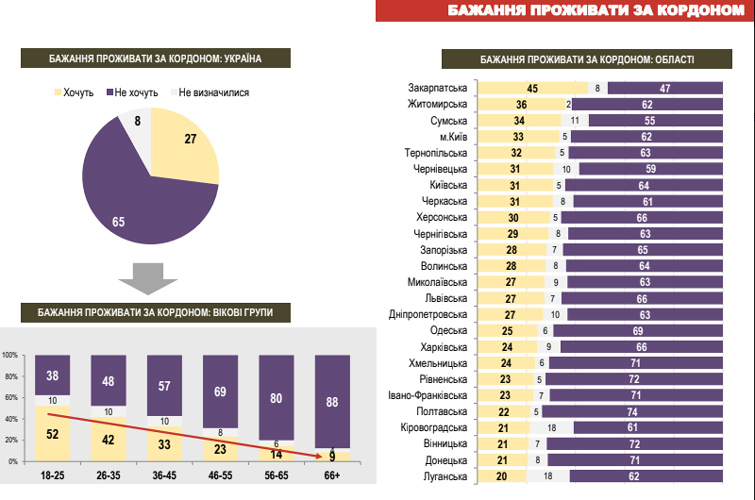 Найбільше людей, які не хочуть жити в Україні, мешкають у Житомирській, Сумській, Закарпатській, Тернопільській, Чернівецькій областях та у Києві.Соціологи відзначають, що бажання емігрувати частіше мають ті, у кого хтось із родичів працює за кордоном.