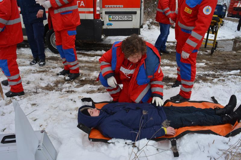 Наступним етапом практичних дій стало проведення відповідних навчань з ліквідації умовної надзвичайної ситуації на залізничному переїзді в м. Мукачево. Там, вантажний автомобіль на швидкості в’їхав в пасажирський потяг, в результаті чого три вагони потягу зійшли з рейок. На місці дорожньо-транспортної пригоди дві людини загинуло, та 70 отримало різного ступеню важкості політравми. У небезпечній ситуації опинилося 170 пасажирів потягу.