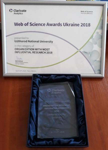 Під час вручення нагороди університету керівники міжнародної організації з моніторингу наукових досліджень Clarivate Analytics відзначили плідну та стабільну роботу УжНУ у сфері організації найважливіших наукових досліджень.