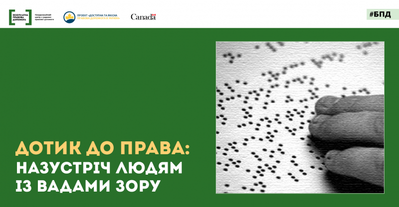 Люди з вадами зору в усіх регіонах України отримають інформацію про систему безоплатної правової допомоги, викладену шрифтом Брайля. Виготовлення таких інформаційних матеріалів стало можливим завдяки спільному українсько-канадському проекту «Доступна та якісна правова допомога в Україні» та співпраці з редакцією Українського товариства сліпих «Заклик».