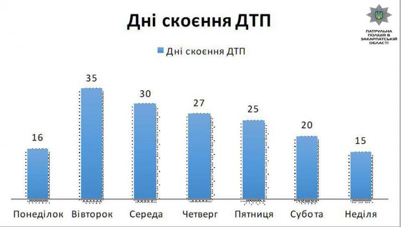 За звітний період, найбільше автопригод зареєстровано у середу. Аналізуючи кількість ДТП за часом скоєння, слід зазначити, пік аварійності припадає з 8:00 до 12:00 години. Незмінною залишається причина автопригод — порушення правил маневрування (43%).