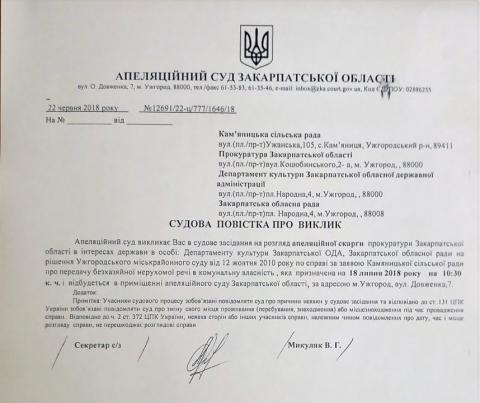 Апеляційний суд Закарпатської області взяв у провадження апеляційну скаргу обласної прокуратури щодо повернення на обласний баланс Невицького замку, який свого часу був переданий Кам’яницькій сільській раді Ужгородського району з грубим порушенням законодавства. Засідання в справі відбудеться 18 липня (див. судову повістку нижче).