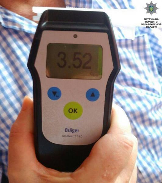 Як зазначили в патрульній поліції Закарпатської області, огляд він пройшов у закладі охорони здоров’я, де результат показав 3,52 проміле.