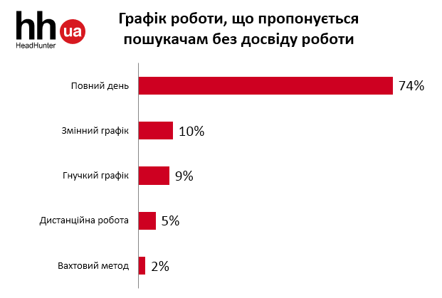 В основному шукають початківців на повну зайнятість, але є можливість знайти різні варіанти графіка роботи. І хоча основна маса вакансій (74%) для фахівців, котрі готові працювати повний день, роботодавці пропонують й інші варіанти: змінний – 10%, гнучкий – 9%, дистанційний – 5%, вахтовий метод – 2%.