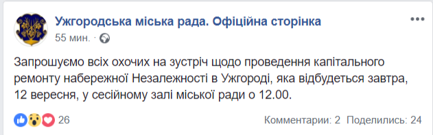 На офіційній сторінці Ужгородської міської ради з'явилося повідомлення про те, що жителів міста запрошують до діалогу щодо капремонту набережної Незалежності.