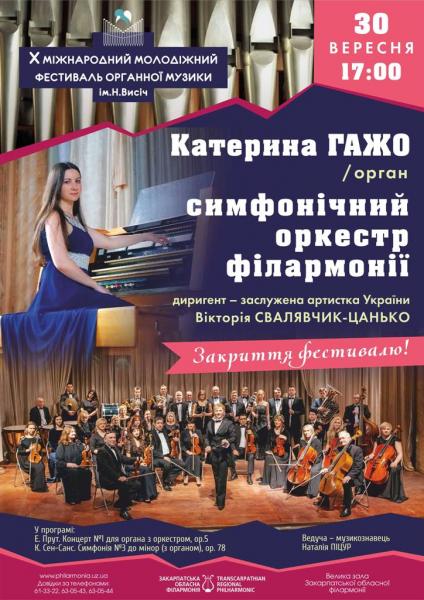 За два тижні на нашій сцені виступили чудові музиканти із Одеси, Луцька, Будапешта, Мішкольця, Праги, Кошиць і, звичайно, Ужгорода. А завершиться фестиваль 30 вересня концертом солістки Закарпатської обласної філармонії Катерини Гажо (орган) та симфонічного оркестру філармонії. Артисти виконають Симфонію № 3 до мінор (з органом) К.Сен-Санса та Концерт № 1 для органа з оркестром Е.Прута. Диригент – заслужена артистка України Вікторія Цанько. Ведуча – музикознавець Наталія Піцур. Початок о 17.00.