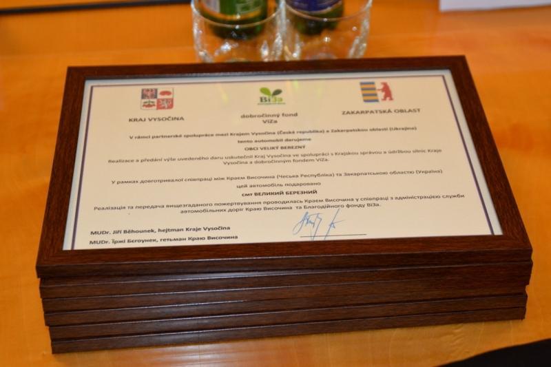 Після перегляду промоцій них відеороликів про принади Закарпаття, відбулося урочисте вручення подарункових сертифікатів на автомобілі для дорожніх служб нашої області. Відтак, керівники та представники самоврядних громад Перечин, Рахів, Тячів, Хуст, Великий Березний і Міжгір’я особисто з рук гетьмана Височина Їржі Бєгоунеку одержали ці сертифікати. На цій приємній ноті й завершено зустріч у стінах сесійного залу облради та зроблено спільне фото на приємну згадку.