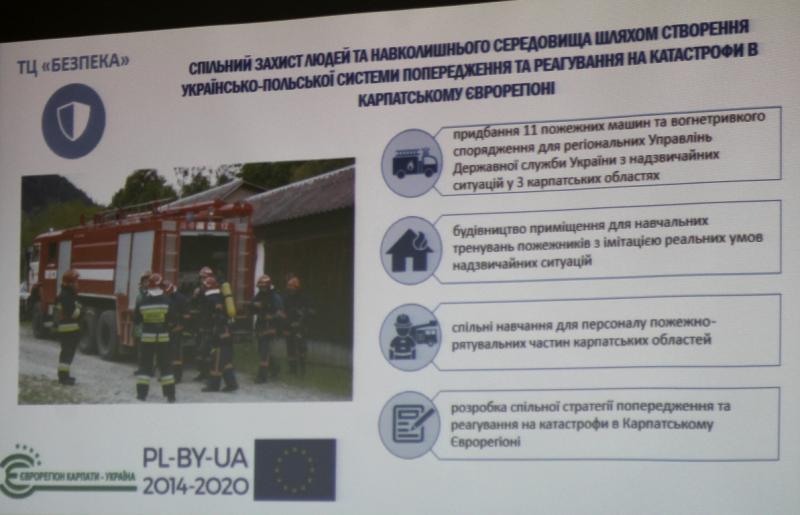 Проект “Спільний захист людей та навколишнього середовища шляхом створення українсько-польської системи попередження та реагування на катастрофи в Карпатському Єврорегіоні” реалізується в рамках Програми транскордонного співробітництва Польща – Білорусь – Україна 2014 – 2020 і є унікальною ініціативою для спільного вирішення проблем реагування на надзвичайні ситуації одразу у 3 карпатських областях України: Івано-Франківської, Львівської та Закарпатської, які чи не найбільше потерпають від стихійних лих. Мета проекту - підвищення рівня безпеки в карпатському регіоні шляхом зміцнення спроможності регіональних служб пожежної охорони та надзвичайних ситуацій, скорочення часу реагування на катастрофи в гірських місцевостях.