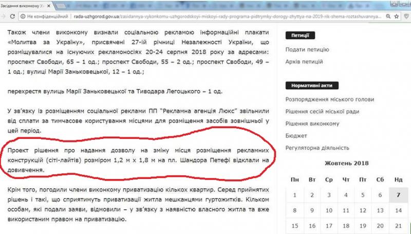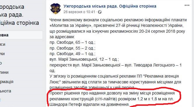 Проект рішення "Про зовнішню рекламу" щодо надання дозволу на зміну місця розміщення рекламних конструкцій (спуск з пішохідного мосту) на площу Шандора Петефі, 14 фізичній особі-підприємцю Буланову Леоніду Михайловичу був розглянутий на черговому засіданні виконкому 26 вересня 2018 року. Тоді члени виконкому не підтрималийого, відклавши питання на довивчення, вирішили, щоб підприємець розглянув інше місце для розміщення сіті-лайтів.