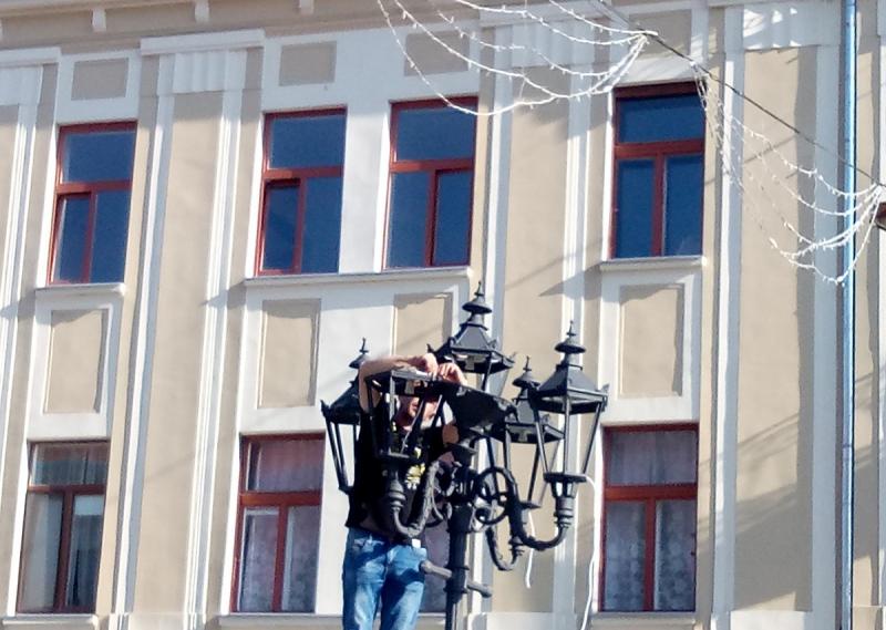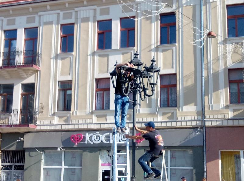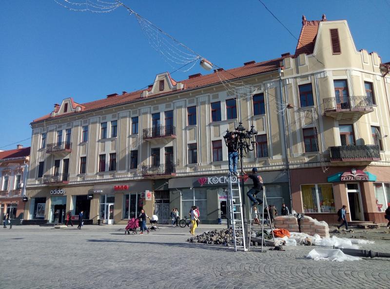 Саме в ці хвилини триває монтаж ліхтарів по центральній частині площі Петефі.