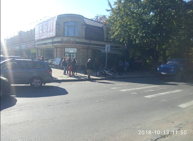 На місці стоїть хетчбек з увімкненою "аварійкою" та мотоцикл. Навколо зібралось чимало перехожих.
