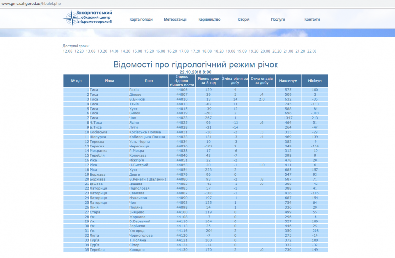 У Закарпатському ж гідрометцентрі інформують, що на річках утримається осіння межень з незначними коливаннями рівнів води. Уже на кінець літа - початок осені (дані станом на 31 серпня) водність річок області становила в басейні Верхньої Тиси - 40-55% норми; на річки західної та центральної частини області - 10-25% від норми, а Ужа - ледве 11,9 % від норми. За більш ніж півтора місяця річки області зміліли ще більше. Закарпатський гідрометцентр наводить дані по області: