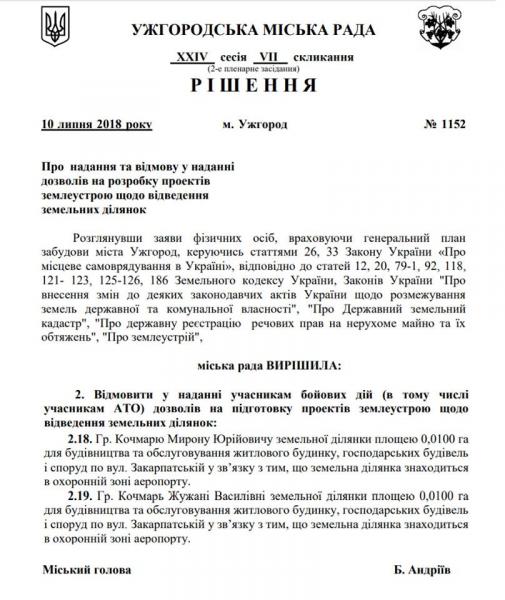 "Сьогодні члени комісії з питань регулювання земельних відносин, містобудування та архітектури Ужгородської міської ради рекомендували сесії Ужгородської міської ВІДМОВИТИ громадянам М.Ю. Кочмарь та Ж.В.Кочмарь, які просять виділити земельні ділянки в охоронній зоні ужгородського аеропорту.