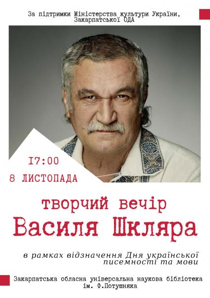 В рамках проведення урочистостей до Дня української писемності та мови (8-9 листопада 2018 року) за підтримки Міністерства культури України та департаменту культури Закарпатської ОДА до Ужгорода завітає відомий письменник сучасності, громадський діяч та лауреат Національної премії імені Тараса Шевченка Василь Шкляр.