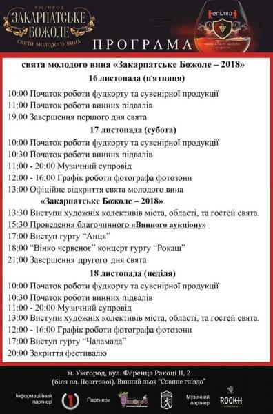 У п’ятницю, 16 листопада, у перший день свята, кращі винороби Закарпаття представлять свою продукцію у підвалах «Совиного гнізда», розпочне роботу і фуд-корт. Офіційне відкриття винного фестивалю – у суботу, 17 листопада, о 13.00. Із 12 години того ж дня працюватиме тематична фотозона. Проведуть у суботу і благодійний аукціон.