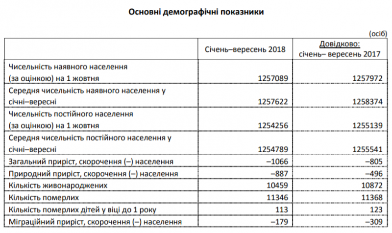 Упродовж січня – вересня 2018 р. чисельність населення зменшилася на 1066 осіб.