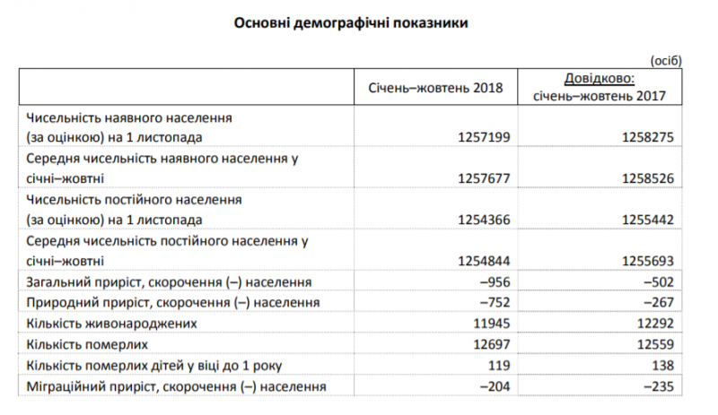 Упродовж січня – жовтня 2018 р. чисельність населення зменшилася на 956 осіб.