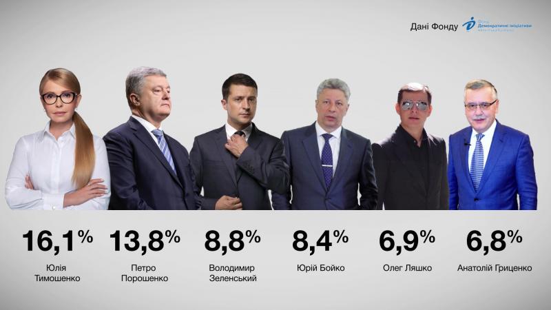 Фонд «Демократичні ініціативи» разом з центром Разумкова оприлюднили свіже опитування. Так, станом на грудень 2018 року Юлію Тимошенко підтримують понад 16% відсотків українців, чинного президента Петра Порошенка – майже 14%.