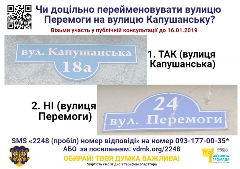 Для остаточного закріплення назви для цієї вулиці запрошуємо ужгородців висловити свої думки за посиланням https://vdmk.org/2248 й обрати один з таких варіантів: 1 - ТАК (вулиця Капушанська) та 2 - НІ (вулиця Перемоги).