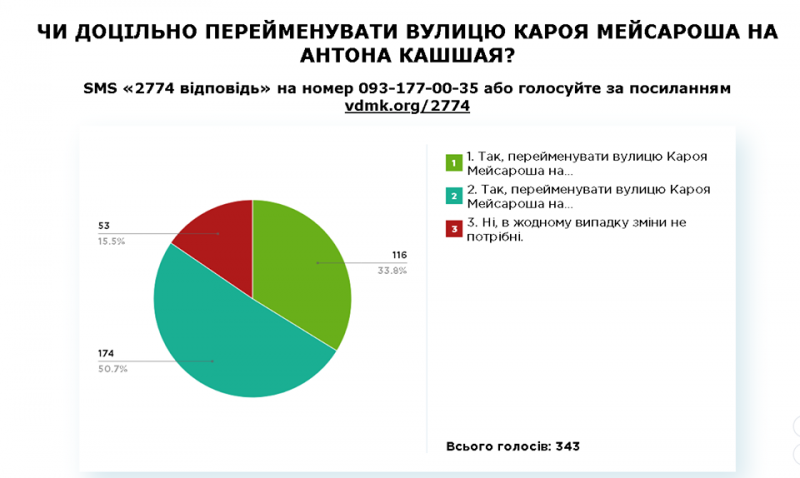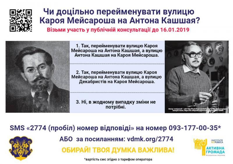 Станом на 9 січня 2019 року на питання, чи доцільно перейменувати вулицю Кароя Мейсароша на Антона Кашшая https://vdmk.org/2774ужгородці відповіли таким чином: