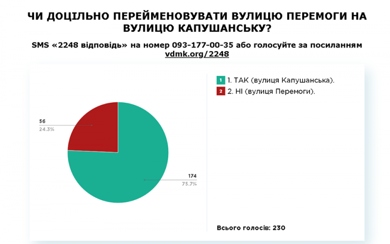 Щодо проміжних результатів, то на питання, чи доцільно перейменовувати вулицю Перемоги на вулицю Капушанську, станом на 9 січня думки ужгородців розділилися наступним чином: 174 підтримують перейменування вулиці Перемоги на вулицю Капушанську, а 56 проти будь-яких змін.