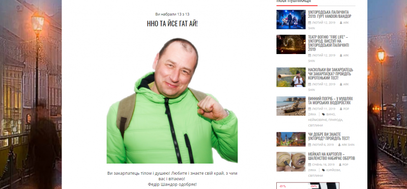 "НАСКІЛЬКИ ВИ ЗАКАРПАТЕЦЬ? Давши відповідь на тринадцять простих питань ви будете знати наскільки ви закарпатець чи закарпатка!" - пропонують розробники тесту. В підсумку, давши відповіді, відомий туризмознавець Федір Шандор дає визначення, наскльки ви близькі до регіону. Наприклад: