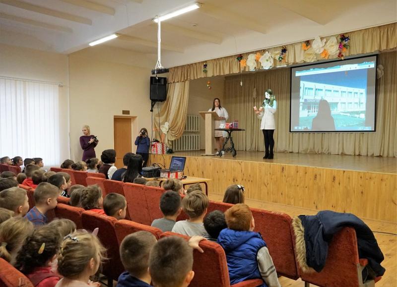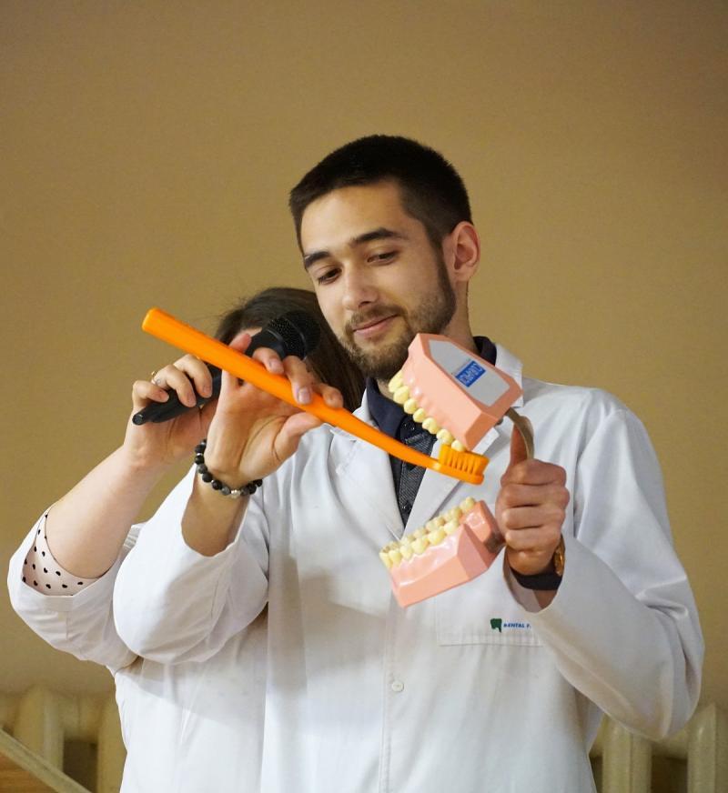 Більше сотні учнів початкової школи зібралися в актовому залі середньої школи. Майбутні лікарі розповідали дітям про те, чому варто чистити зуби і наочно – на прикладі великої штучної щелепи та за допомогою гігантської зубної щітки – показували, як це робити. Чи всі діти мають свої індивідуальні зубні щітки? Чи всі користуються зубною пастою щоранку і щовечора? Першачки схвально гукали у відповідь на ці питання і хочеться вірити, що так справді і є. Діти декламували вірші, брали участь у інтерактивних опитуваннях і отримували за це чудові подаруночки – зубні пасти і щіточки. А насамкінець переглянули мультиплікаційний фільм, у якому герої-звірята розповідали про злісних каріозних монстрів та боролися з ними.