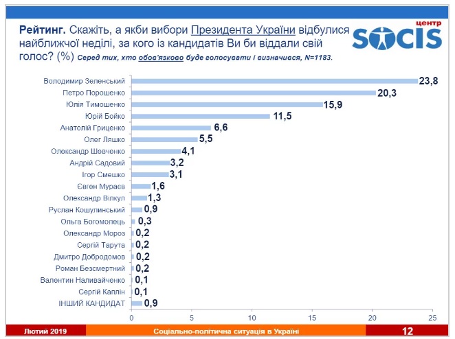 За даними опитування, серед тих, хто обов’язково прийде на вибори і вже знає, кому віддасть свій голос, майже 24% готові поставити галочку біля прізвища Зеленський, ще понад 20% проголосують за Петра Порошенка. Юлії Тимошенко готові віддати голоси менше 16% респондентів. Замикають п’ятірку – Юрій Бойко і Анатолій Гриценко із 11% і майже 7% відповідно.