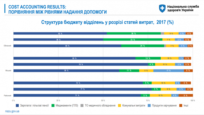 Показовими є також дані щодо використання коштів. Так, за показниками 2017 року на районному рівні в середньому в лікарнях 71% коштів ішло на зарплати, на комунальні послуги – 12%, ліки – 5%, харчування – 4%. Тоді як у стаціонарах міст розподіл свідчить уже про дещо більшу ефективність на користь пацієнтів – 59% на зарплати, 8% – на комунальні послуги і 11% – на медикаменти.