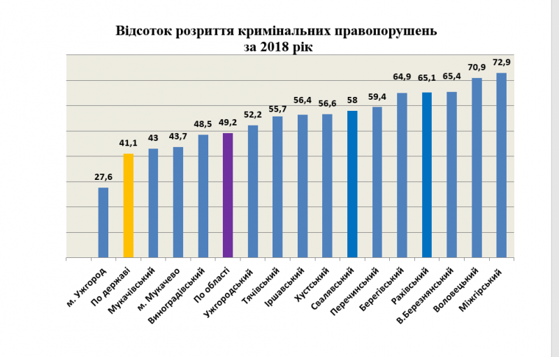 Відсоток розкриття кримінальних правопорушень, у яких особам повідомлено про підозру (без урахування минулих років) становить 49,2% (5114), що є восьмим результативним показником у державі.