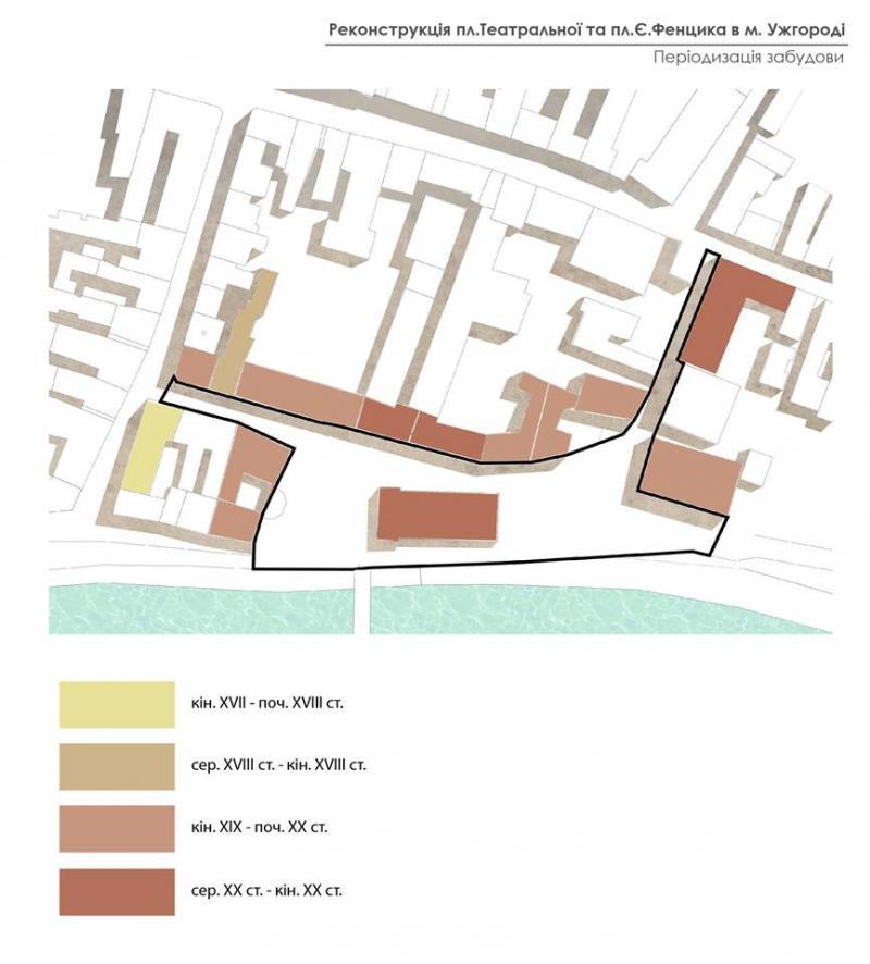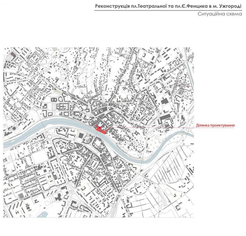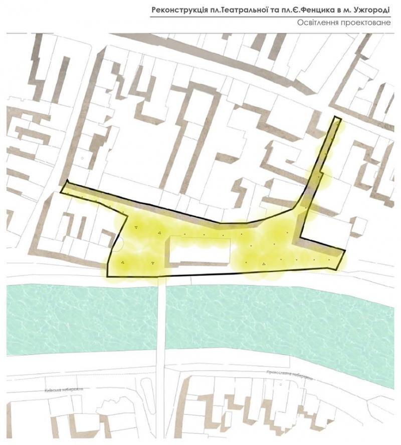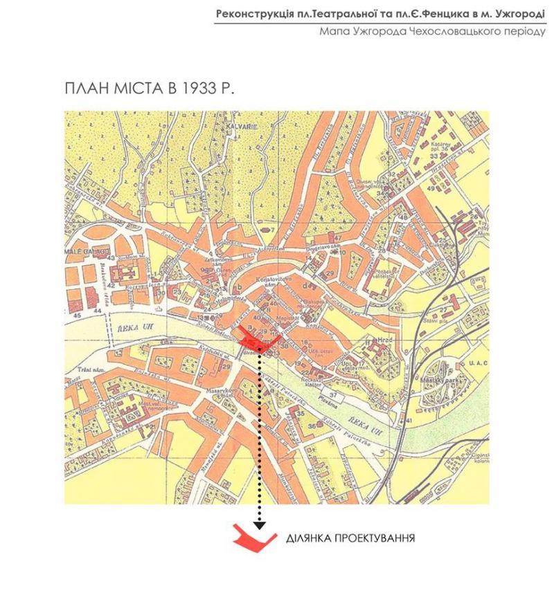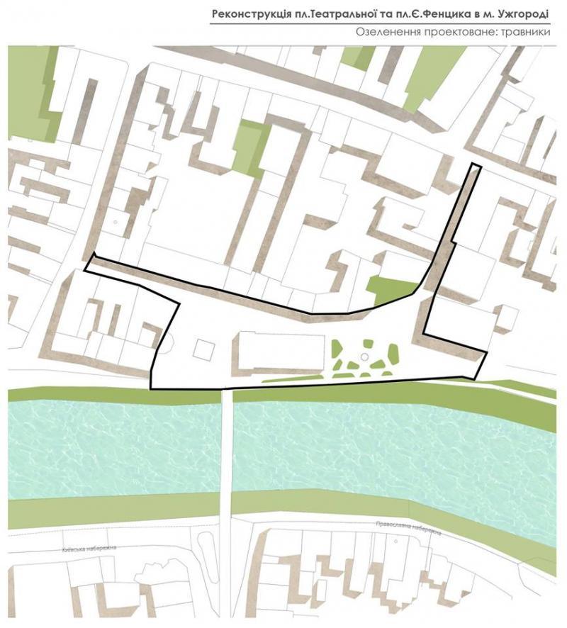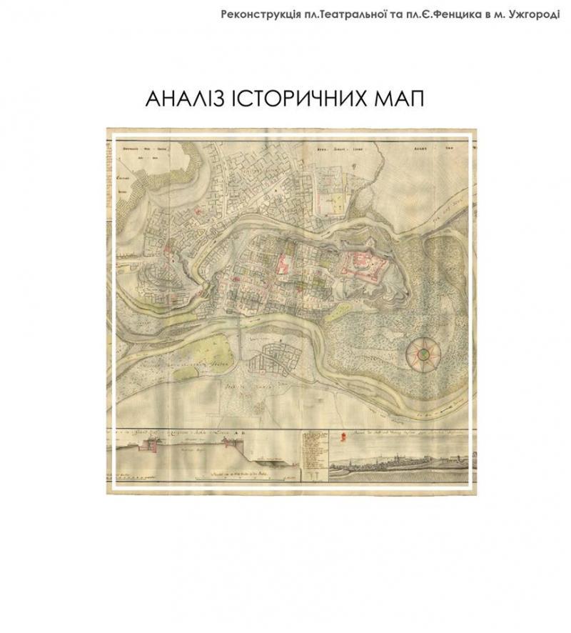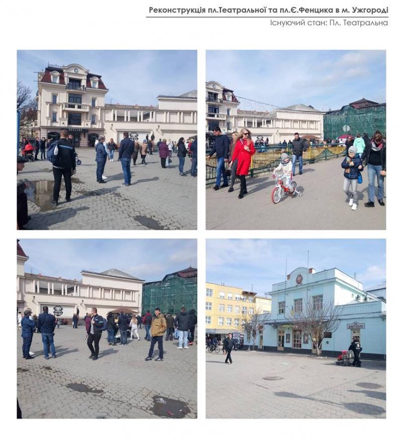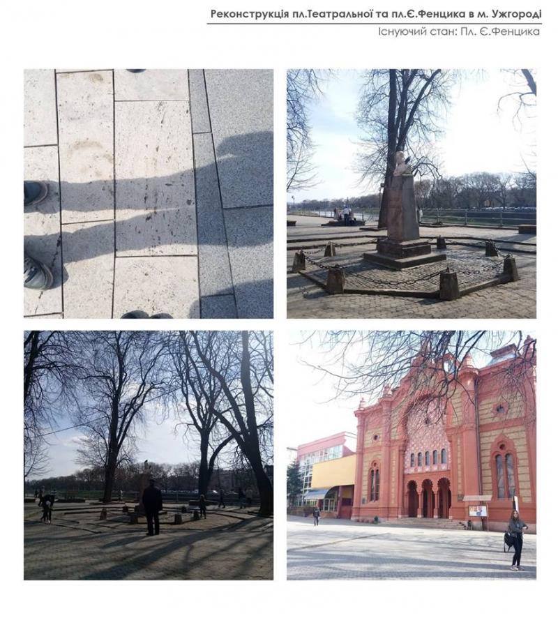 Що стосується проекту в Ужгороді, то, як відзначила Ольга Криворучко, розпочали роботу із вивчення інформації, яке значення має ця ділянка для міста. Також зосередилися на аналізі історичних карт Ужгорода. Проаналізували нинішній стан площі: мощення, покриття, освітлення, як вона використовується зараз. Вивчали, як там ходять люди, тобто найбільш інтенсивні потоки, щоб правильно розмістити освітлення, лавки для сидіння тощо, особливо звертали увагу на стан озеленення.