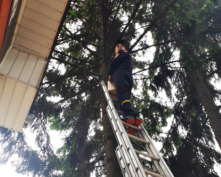 На місце події прибули бійці ДСНС 10-ї державної пожежно-рятувальної частини. За допомогою спецдрабини вони повернули «загубленця» до гнізда, яке ці нічні птахи облаштували на сосні біля бару.