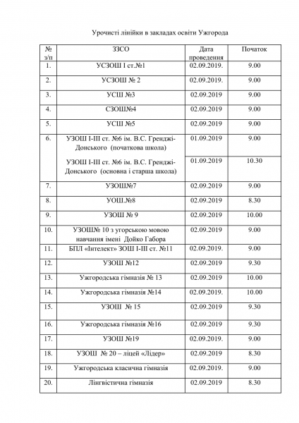 дзвоника проведуть у понеділок, 2 вересня, лише в УЗОШ №6 ім. В.С. Гренджі-Донського – у неділю, 1 вересня. Докладніше – у таблиці, підготовленій управлінням освіти Ужгородської міської ради