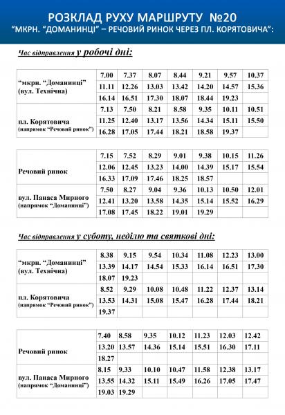Розклад руху автобусів №20 на маршруті “мкрн. “Доманинці” – Речовий ринок через пл. Корятовича”.