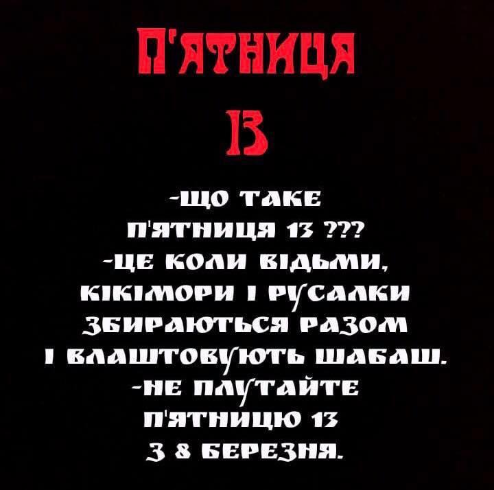 Забобонні і не дуже закарпатці активно діляться жартами про п'ятницю, 13-те, якій мільйони людей приділяють особливу увагу й вірять у містичну силу цього дня та невдачі, які він за собою несе. Ми в Uzhgorod.net.ua зібрали реакції соцмереж на цю тему.