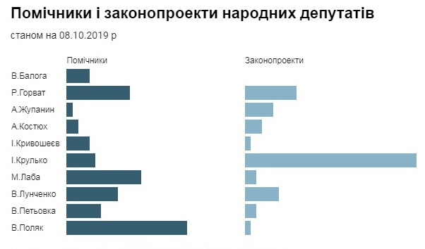 У той же час усі закарпатські депутати, крім В.Балоги, вже встигли скористатися своїм правом законодавчої ініціативи і подали законопроекти. Найменше їх – по одному – у В.Поляка та І.Кривошеєва. А найбільше – аж 30 – співавтором яких зазначений Іван Крулько. Другий та третій за продуктивністю – Р.Горват та В.Лунченко, в яких 9 та 6 законопроектів відповідно.