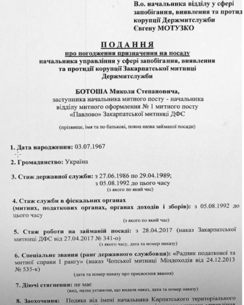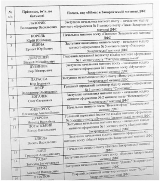 "Добрий ранок! Тут птічка на хвостику принесла майбутніх керівників пунктів пропуску Закарпатської митниці. За моєю їнформацією Київ їх вже погодив, хоч вони і будуть у якості виконуючих обов‘язки. Наказ про призначення - питання кількох днів. Отже, майбутні керівники митниці тут: