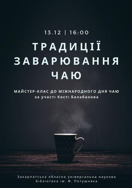 Який чай пити? Скільки хвилин заварювати? Що таке чайна плівка та чому вчорашній чай - гірше отрути змії? Про все це та більше поговоримо о 16:00 13 грудня в Закарпатській обласній універсальній науковій бібліотеці ім. Ф. Потушняка!