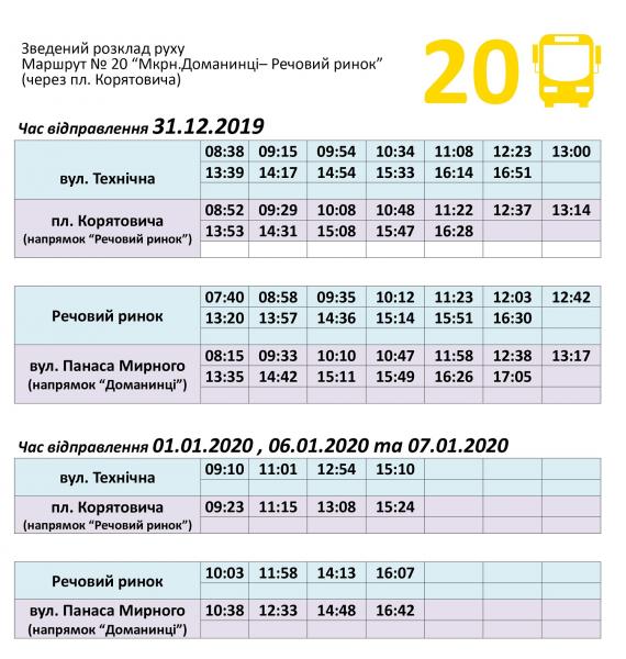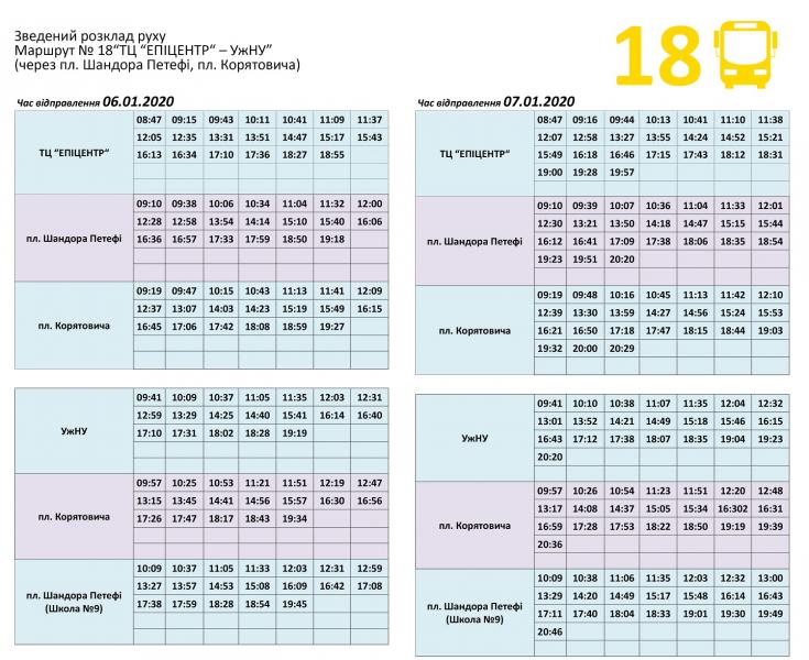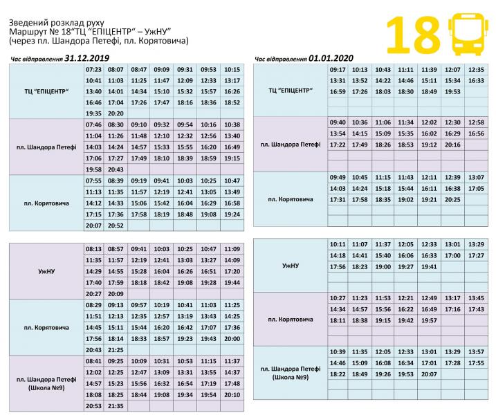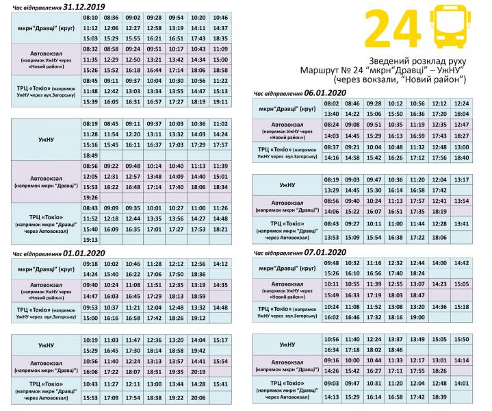 Розклад руху міських автобусів №№ 18,20,24, які обслуговує КП "Ужгородський муніципальний транспорт", на новорічні та різдвяні свята.